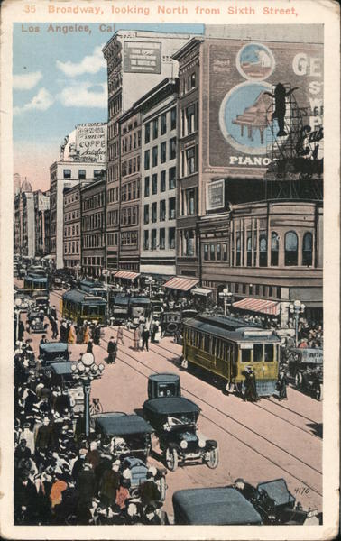 Front: 35 Broadway, looking North from Sixth Street, Los Angeles, Cal Sheet Masic GE S 61 attBIAN DENHI STEEL CO COPPE Salisfien PIANO 4170 Back: "LOS ANGELO COM Pub. by the M, Kashower Co., Los Angeles, Cal.