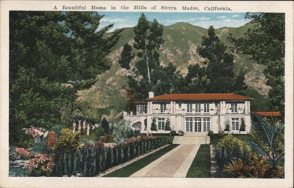 Front: A Beautiful Home in the Hills of Sierra Madre, California. Back: 23925 POSTCARDCO. CALIFORNIA LOS ANGELES Los Angeles, California. C% Published by California Postcard Co.,