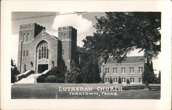 Front: LUTHERAN CHURCH YORKTOWN, TEXAS. Back: World's Largest Kodak Finishers THE FOXCO The Fox Company San Antonio, Texas Edman ce Jace Fales Texan cety PRICE PHOTO P.c. 3 -