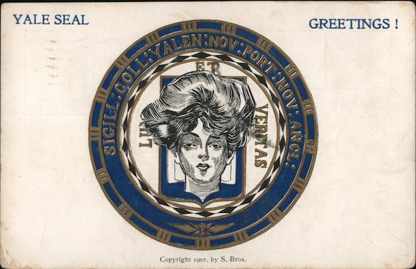 Front: YALE SEAL GREETINGS! GOLLIYALENENOV:PORT:NO ACK Copyright 19o7, by S. Bros. VERITAS Back: FLP uaa 190 UNITED STATESOF CHILAR 00 DA DNS ONLY 1706 FRANKLIN 1790 Miss Lillian Hallowell 131 CE Sehigh Ave City
