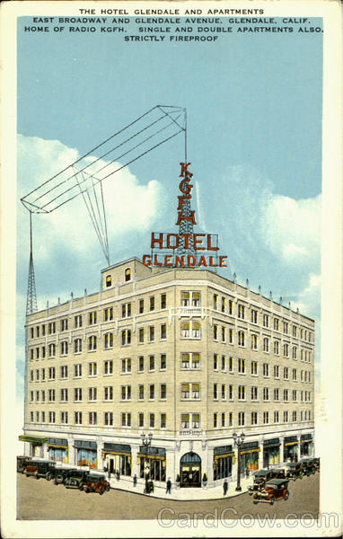 | Home of radio KGFH. Single and double apartments also. Strictly fireproof. The Glendale Hotel, East Broadway at Glendale Avenue, Glendale, California. 160 rooms from $1.50 to $8.00 dailyaol.com 45 apartments with kitchenette from $50.00 to $125.00 per month. Both single and double. all modern conveniences, of course. Dining room and garage in connection. Special 50c Luncheon and $1.00 dinner. Twenty minutes to Hollywood and Los Angeles; 10 minutes to Pasadena. Home of radio KGFH. The Glendale hotel, Glendale, California "Where the Beds are Soft". |