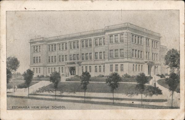 Front: HEI EE %D ESCANABA NEW HIGH SCHOOL. Back: 0621 INTA: DWABA, AR OSIOMLS CELINA THE SPACE ABOVE IS RESERVED FOR POST MARK THIS SPACE RESERVED FOR MESSAGE Ms. Mita tech Crystal halking