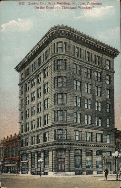 Front: 3515 Garden City Bank Building, San Jose, California "On the Road of a Thousand Wonders" Back: UNTED 10 POSSESSIONS, 2ยข PUBLISHED BY CARDINELL-VINCENT CO., SAN FRANCISCO,