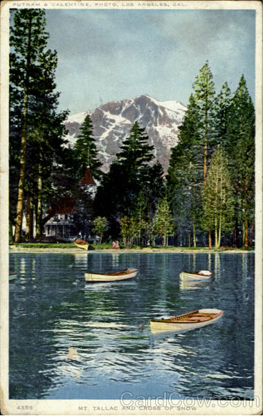 Mt. Tallac and cross of snow. Mt. Tallac as seen from the Pier at Tallac. The summit is about 4000 feet above Lake Tahoe and the cross is marked by snow till late Summer