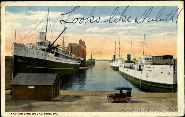 Front: TIORESTA Looks like Suluth! ANCHOR LINE DOCKS, ERIE, PA. CODORUS CODORUS, Back: A-57760 JUN 8 1230PM 1916 Mr. C.P. Seyman P.Seyman Carneyville, Wyoming. wish ΠΈΠΌ 6/8/86 shpised from had Very muddy C. Buffalo - Detrat