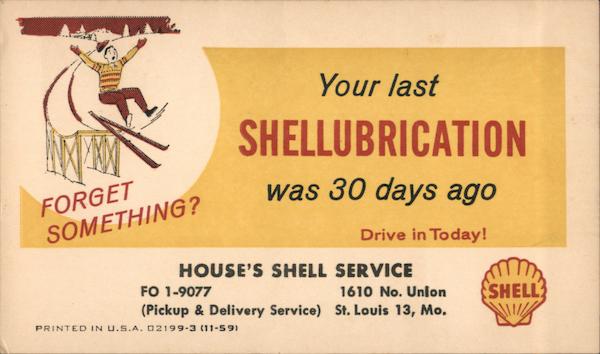 Front: Your last SHELLUBRICATION FORGET SOMETHING? was 30 days ago Drive in Today! HOUSE'S SHELL SERVICE FO 1-9077 1610 No. Union (Pickup & Delivery Service) St. Louis 13, Mo. SHELL Back: U.S. POSTAGE 3¢ NI WE TRUST AK