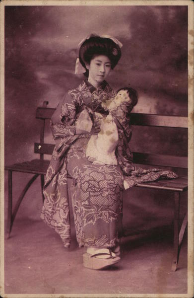 Girl on a Bench With Cloth Doll, Kimono, Geisha Wig, Okobo