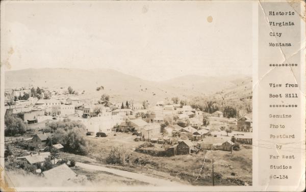 Front: Historic Virginia City Montana 水** 不**水 * View from Boot Hill : : : : : Genuine Pho to Po st Card by Far West Studio s #C-134 Back: PHOTTO DEVOLITE PEERLESS