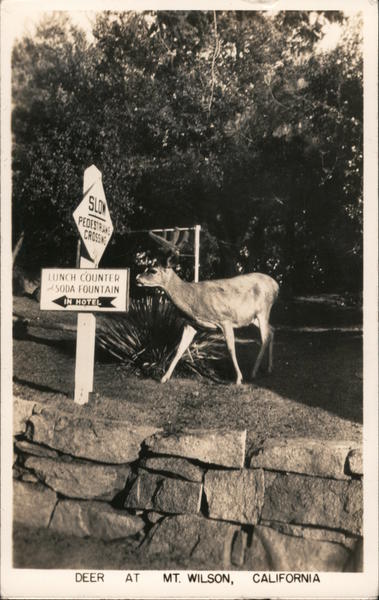 Front: SLON PEDESTRANE CROSSNG LUNCH COUNTER SODA FOUNTAIN IN HOTEL CALIFORNIA AT MT. WILSON, DEER Back: FLUCKY MET SET CARD LINCOLN 40 CORRESPONDENCE! Mrs. Bart Spence ( 1808 Mark Twain Palo Alto Cali کا Pos