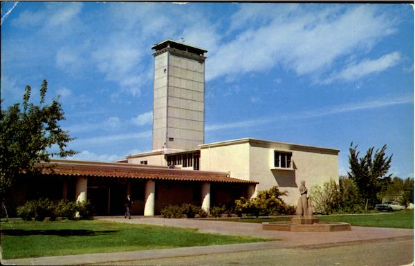 The New Mexico Institute of Mining and Technology comprises three divisions: The College prepares young men and women for careers in several fields of Science and engineering. The Bureau of Mines and Mineral Resources employ engineers and geologists who conduct original studies in all mineral and water resources of New Mexico. Research and Development Division conducts basic research related to the locations of ground water and the understanding of Cloud-Precipitation phenomena "Rainmaking". In front of building is Symbolic sandstone statue "The Desert maid" by E. S. Ludlam. Research and Development Laboratory was built in 1949. |