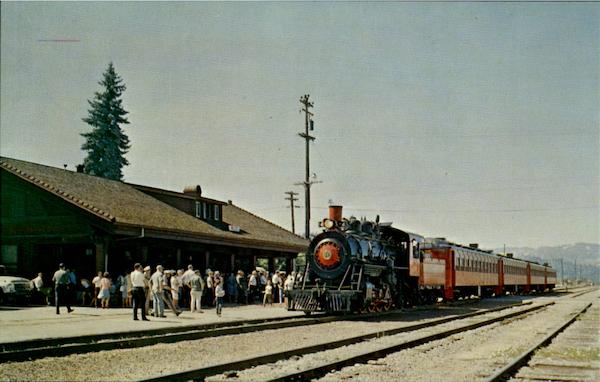 The "Super Skunk" Steam Train in front of historic old Redwood Station Building at Willits, Calif.