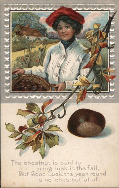 Front: The chestnut is said to bring luck in the fall, But Good Luck the year round is no "chestnut" at all. Back: ruriery សេណណណណណ Lucile ns- OC KOKOON