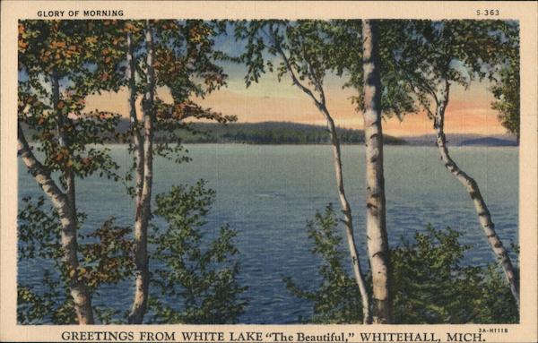 Front: GLORY OF MORNING S-363 3A-H1118 GREETINGS FROM WHITE LAKE "The Beautiful," WHITEHALL, MICH. Back: "C.T. ART-COLORTONE" REG.U.S. PAT. OFF. MADE ONLY BY CURT TEICH & CO., INC., CHICAGO C. T. INLAND LAKE SCENES