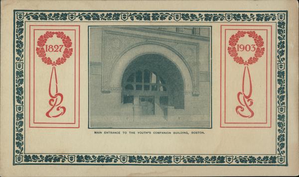 Front: 回 可 1827 1903 MAIN ENTRANCE TO THE YOUTH'S COMPANION BUILDING, BOSTON. Back: set THE SPACE ABOVE IS RESERVED FOR POSTMARK. POST-CARD.