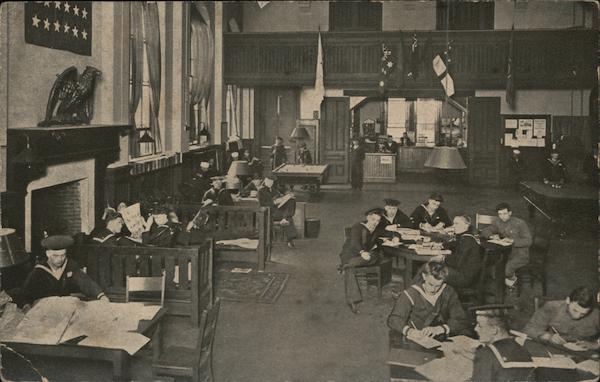 UNITED SERVICE CLUB, 48 Boylston St., BOSTON for Men of Army and Navy General Lounge, showing canteen and office, fireplace and cosy corner, reading and writing tables. WA COMMUNIT CAMP SERVICE