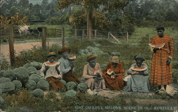 Front: SHO' DO LOVE MELONS, SCENE IN OLD KENTUCKY Back: 279/8- 215) WRENN & KING, IMPORTERS & MANUFACTURERS, LEXINGTON, KY. A-25647