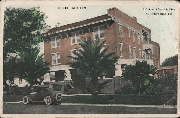 Front: HOTEL GOTHAM 3rd Ave ,S.bet.4 & 5 Sts. St. Petersburg, Fla. Back: Hie * Mr. Foster Travel Information Service Miami, FL 4105 Photo Rio