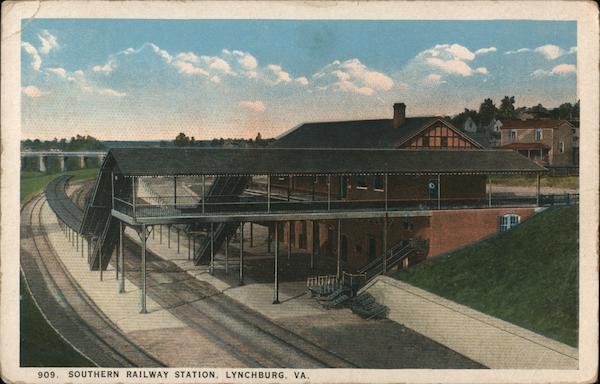Front: 909. SOUTHERN RAILWAY STATION, LYNCHBURG, VA. Back: FOR WRITING MESSAGES. CHROME A-39453 BELLS 229 MADE IN USA SUPERIOR QUALIT Mrs & PUBLISHED BY J. P. BELL CO., INC., LYNCHBURG, VA. C. T AMERICAN ART ZE