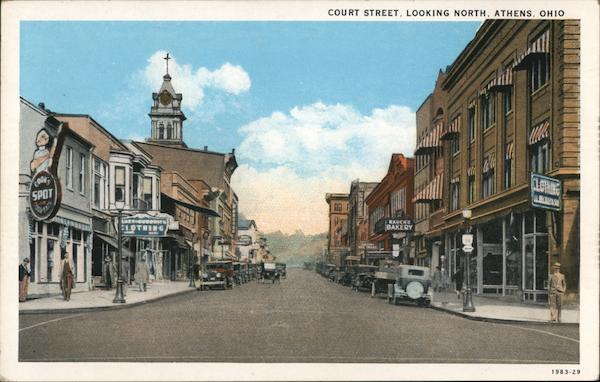 Front: COURT STREET, LOOKING NORTH, ATHENS, OHIO SPOT ALBECALIA S RAUCH'S CLOTHING BAKERY 1983-29 ncown Back: C. T. AMERICAN ART COLORED TE