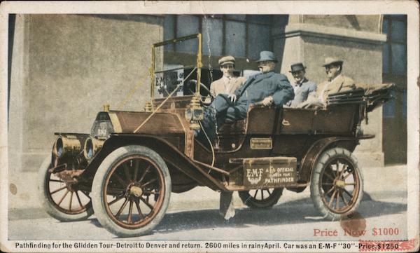 Pathfinding for the Glidden Tour-Detroit to Denver and return. 2600 miles in rainyApril. Car was an E-M-F "30'"-Price,$1250