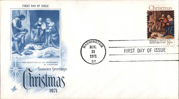 FIRST DAY OF ISSUE Christmas Giorgione, ca. 1478-1510 National Gallery of Art FIRST DAY OF ISSUE 10 1971 DC THE ADORATION OF THE SHEPHERDS BY GIORGIONE Season's Greetings (hristmas Art Craft 1971