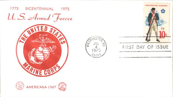 1775 BICENTENNIAL CONTINENTAL MARINES 1975 U. S. Armed forces US HE UNITED 10c JUL 1975 20013 FIRST DAY OF ISSUE MARINE CORPS AMERICANA UNIT KON. DC OC
