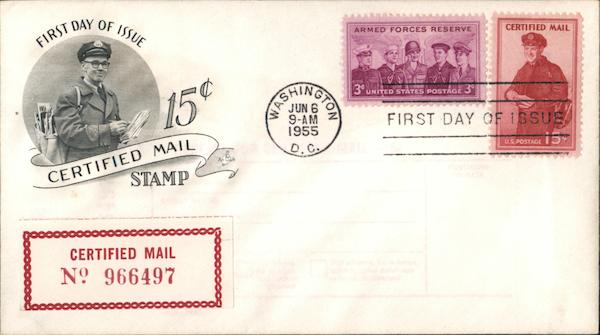 FIRST DAY OF ISSUE ARMED FORCES RESERVE CERTIFIED MAIL FINGTON 3' UNITED STÄTES POSTAGE 3 15¢ JUN 6 9-AM 1955 FIRST DAY OF 1SSUE CERTIFIED MAIL D.C. 15 At Craft CERTIFIED MAIL No 966497