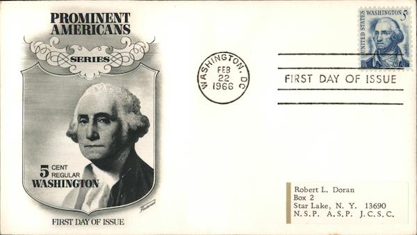 PROMINENT AMERICANS SERIES D FEB 22 1966 FIRST DAY OF ISSUE REGULAR Robert L. Doran Box 2 Star Lake, N. Y. 13690 N. S.P. A. S. P. J. C. S. C. Flecetwood FIRST DAY OF ISSUE DO