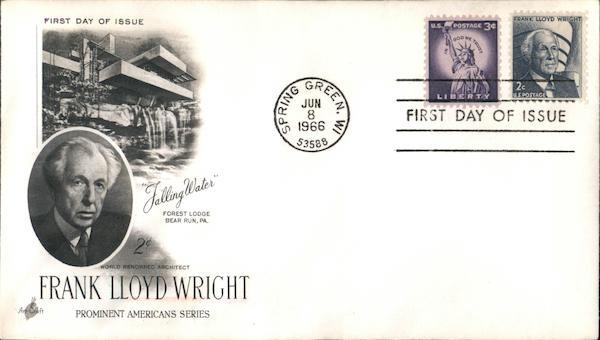 FRANK LLOYD WRIGHT FIRST DAY OF ISSUE U.S. POSTAGE 3ยข BREENT 2c JUN 1966 FIRST DAY OF ISSUE 53588 JelligWater" FOREST LODGE BEAR RUN, PA. WORLD RENOWNED ARCHITECT FRANK LLOYD WRIGHT A Craft PROMINENT AMERICANS SERIES E TRUST WI ONI