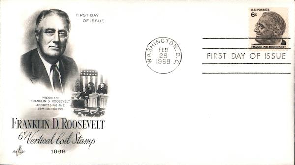 FIRST DAY 6c OF ISSUE INCTOR FRANKLIN D.ROOSEVELT FEB AI 28 FIRST DAY OF ISSUE 3 1968 0 PRESIDENT FRANKLIN D. ROOSEVELT 73RD CONGRESS FRANKLIN D. ROOSEVELT 6Norlical loil Stamp Arf Croft 1968