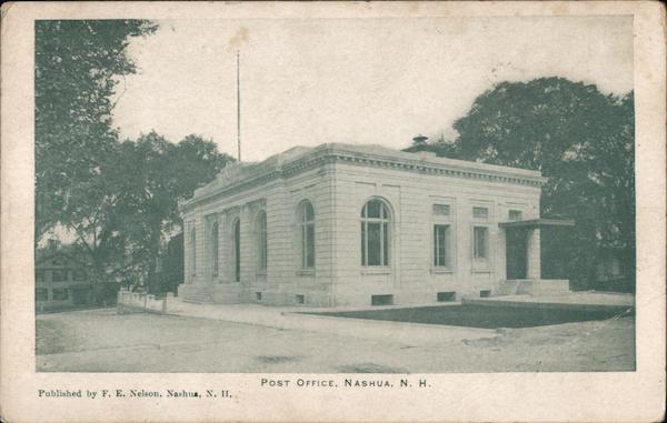 Front: POST OFFICE, NASHUA, N. H. Published by F. E. Nelson, Nashua, N. H. Back: Place the Stamp Here. One Cent for United States and Island Possessions, Cuba, Canada and for Foreign. .....