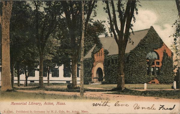 Front: Memorial Library, Acton, Mass. with love Uncle Fred S 87841. Published in Germany by N. J. Cole, So. Acton, Mass. Back: CREIENTO UNITED STATES OF 1906 in 120. FRANKLIN 1790 ON Miss Mabel Homson Lowell Mass * 342 Westford Street