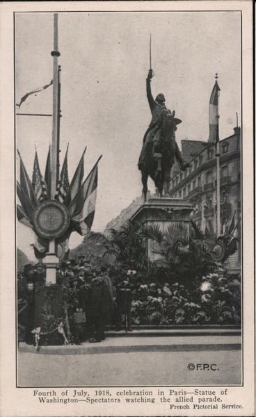 OFP.C. Fourth of July, 1918, celebration in Paris—Statue of Washington-Spectators watching the allied parade. French Pictorial Service.