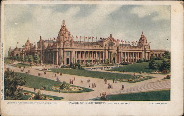 Front: AI V. 0. HAMMON PUB. CO., MINNEAPOLIS, MINN. 1 行 No. 123. LOUISIANA PURCHASE EXPOSITION, ST. LOUIS, 1904. PALACE OF ELECTRICITY. SIZE 525 X 700 FEET. COST $399,940.00 Back: UNITEDSTATES AND CANADA, FORFIGN, Two CENTS.