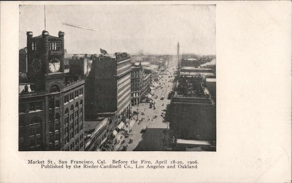 Front: Market St, San Francisco, Cal. Before the Fire, April 18-20, 1906. Published by the Rieder-Cardinell Co., Los Angeles and Oakland Back: SOUVENIR M. RIEDER, PUB., LOS ANGELES, CAL.
