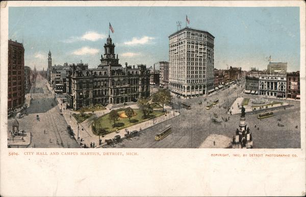 Front: WONO TU WELCOME 5404. CITY HALL AND CAMPUS MARTIUS, DETROIT, MICH. COPYRIGHT, 1902, BY DETROIT PHOTOGRAPHIC CO. Back: AND CANADA, FOREIGN, Two CENTS. Mrs Sanda Davis