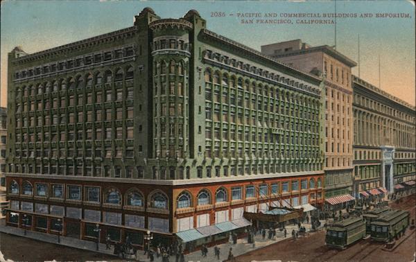 Front: 2086 -PACIFIC AND COMMERCIAL BUILDINGS AND EMPORIUM, SAN FRANCISCO, CALIFORNIA Back: 1.57 MADE IN AMERICA BY EDW HMITCHELL AT SAN FRANCISCO