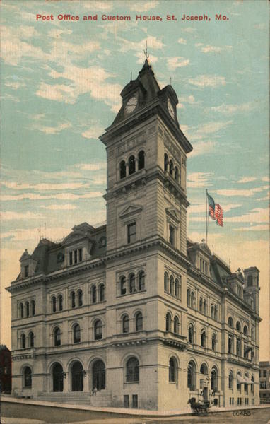 Front: Post Office and Custom House, St. Joseph, Mo. 66483 Back: 2- SOUVO CHROME PGO SUPERIOR QUALITY FOREIGN- THIS SPACE MAY BE USED FOR MESSAGE