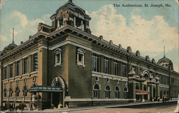 Front: The Auditorium, St. Joseph, Mo. Back: SOSER MADE IN U.S. A. 15-21-9 aver is lobo IK OCT 1463 6-FINA ST 1912 PUBLISHED BY AMERICAN CALENDAR CO., ST. JOSEPH, MO. Owen sound ะพ Out Canada A-17245