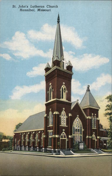 Front: St. John's Lutheran Church Hannibal, Missouri Back: ST. JOHN'S LUTHERAN CHURCH (Founded 1860) Located on Lyon and Maple Ave. Hannibal's only Lutheran Church 8B80-N HANNIBAL NEWS CO., HANNIBAL, MO., DISTRIBUTOR