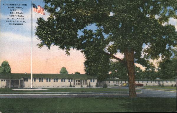 Front: ADMINISTRATION BUILDING, O'REILLY GENERAL HOSPITAL, U. S. ARMY, SPRINGFIELD, MISSOURI Back: со 3742N Post CABO PUB. BY R. W. ROSEBERRY CO., SPRINGFIELD, MO.
