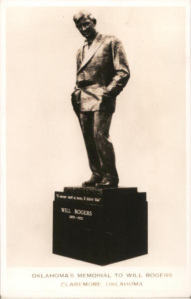 Front: 9 never met a man I didn't like" WILL ROGERS 1879-1935 OKLAHOMA'S MEMORIAL TO WILL ROGERS CLAREMORE OKLAHOMA Back: 0992 150 ca Si