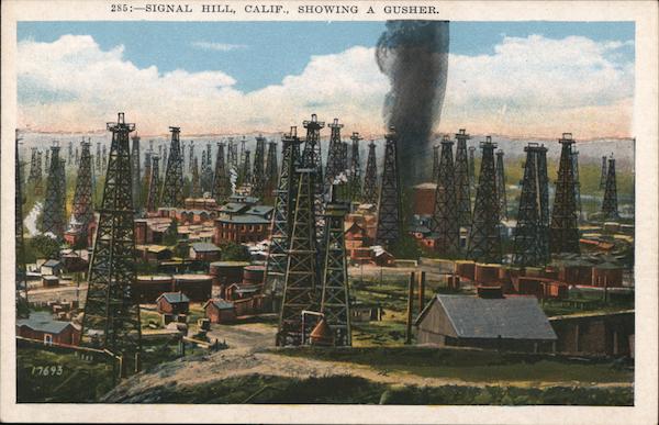Front: 285:-SIGNAL HILL, CALIF., SHOWING A GUSHER. 17693 Back: 50+ Place the Stamphere and Island Possessions Cuba Canada and Pub. by M. Kashower Co., Los Angeles, California. DACO >*