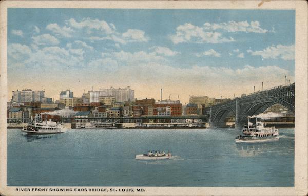 Front: RIVER FR ONT SHOWING EADS BRIDGE, ST. LOUIS, MO. Back: #3s B1. - A-71328 RIVER FRONT SHOWING EADS BRIDGE, ST. LOUIS MO. PAD C. TAMEDICAN ART CE