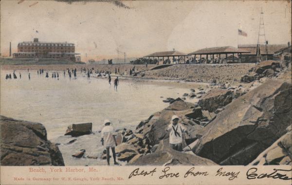 Front: Rest Sove from roy Batoa Beach, York Harbor, Me. Made in Germany for W. N. Gough, York Beach, Me. Back: RA GRESS 202 UNITED STATES OF Mis Alena Godagon APR 1 2.7 8 AM 1908 ME 1206 FRANKİJN 1290 6:34. /Broadway överett Mass 97479