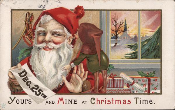 Front: Yours AND MINE Christmas Time. AT DEC.25TH Back: ESTDA isiu FOR ADDRESS JONAM MASS Miss Myra č. Jareret Christmas fum Evelyn all nell will enjoy yo Hope you are Cohasset. Mass. 89 Seties 68 F