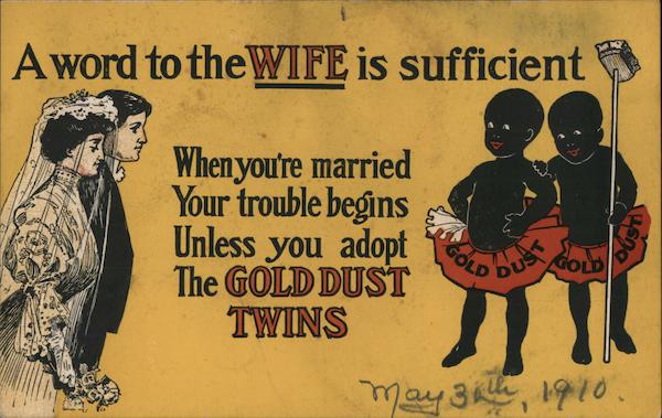 Front: Aword to theWIFE is sufficient When you're married Your trouble begins Unless you adopt The GOLD DUST TWINS DUST GOLD GOLD May3hh 910 Back: 229/9- AND CANADA, FOREIGN, THIS SPACE MAY BE USED