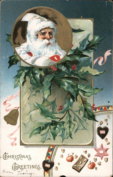 Front: GHRISTMAS GREETINGS. Frm Tuong. Back: ANICA UNITED STATES OF oo 279 POST CAR DISU, Miss Ruth Carr " Y 180 faurelst Manchester 2. F