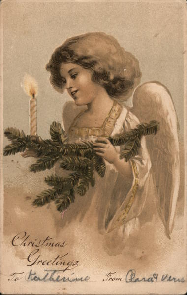 Front: Christmas Greetings To tatherine From Clarat Vars celir Back: Post CARE % So katherine NO 6032 frond Ceria & vera INTERNATIONAL ART PUBL Co. NEW YORK FOR THE ADDRESS.