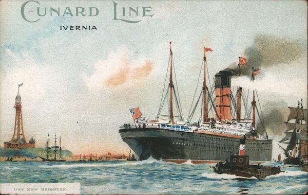 Front: (UNARD |INE IVERNIA 111m OFF NEw BRIGHTON. Back: 20 UNIVERSAL POSTAL UNION. If Posted in U.K. For Inland use, d. stamp. For Postal Union, 1d, stamp. If Posted in U.S.A. For Inland use, 1 cent. If posted in Postal Union, 2 cents.